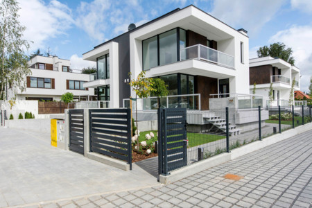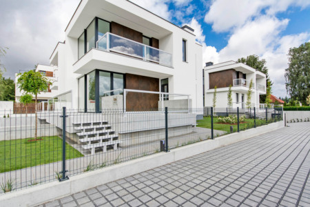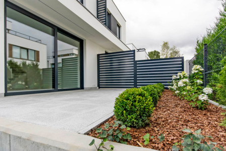Ogrodzenie frontowe aluminiowe malowane w kolorze antracytowym (tylko budynek A1, A2). Furtki wejściowe aluminiowe, malowane w kolorze antracytowym wyposażone w domofon. Pozostałe ogrodzenie systemowe w kolorze jak wyżej.