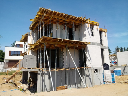 Ściany piwnic, słupy i podciągi monolityczne żelbetowe, kondygnacja nadziemna murowana z pustaków silikatowych lub żelbetowa, stropy żelbetowe, biegi schodowe i spoczniki żelbetowe.