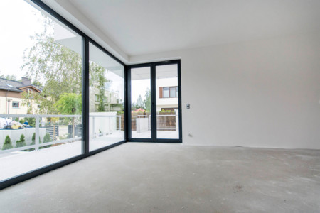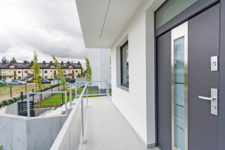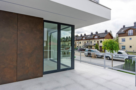 Nowoczesna stolarka okienna i drzwiowa aluminiowa/ PCV, HS (tylko budynek B1, B2) o podwyższonej izolacyjności akustycznej ze szkleniem dwukomorowym. Od zewnątrz i wewnątrz w kolorze antracytowym.