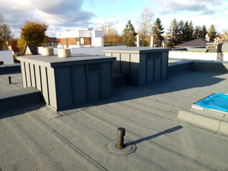 Stropodach płaski, ocieplony grafitowym styropianem o grubości od 25 do 46 cm, kryty podwójnie papą termozgrzewalną w systemie Izolmat.