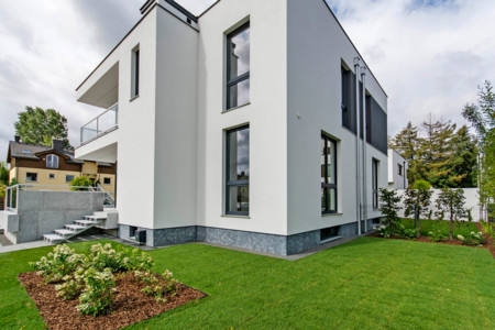 Elewacje o wysokich parametrach termoizolacyjnych, styropian grafitowy grubości 15 cm, wykończone tynkiem cienkowarstwowym mineralnym malowane farbą silikonową. Cokół z materiałów o obniżonej nasiąkliwości. Parapety okienne z granitu szarego i obróbki blacharskie wykonane z blachy stalowej powlekanej. Dodatkowo elementy elewacyjne wykończone spiekiem kwarcowym w kolorze cortenu montowane na profilach ocieplonych wełną mineralną.