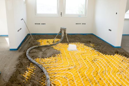 Wylewka cementowa tzw. pływająca, oddylatowana od przegród pionowych, wylewana na styropianie.