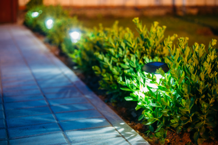 Oświetlenie ledowe nad balkonami, tarasami i daszkami wjazdowymi do garaży. Kinkiety zewnętrzne (tylko budynek B1, B2) Lampy zewnętrzne w ogródkach.